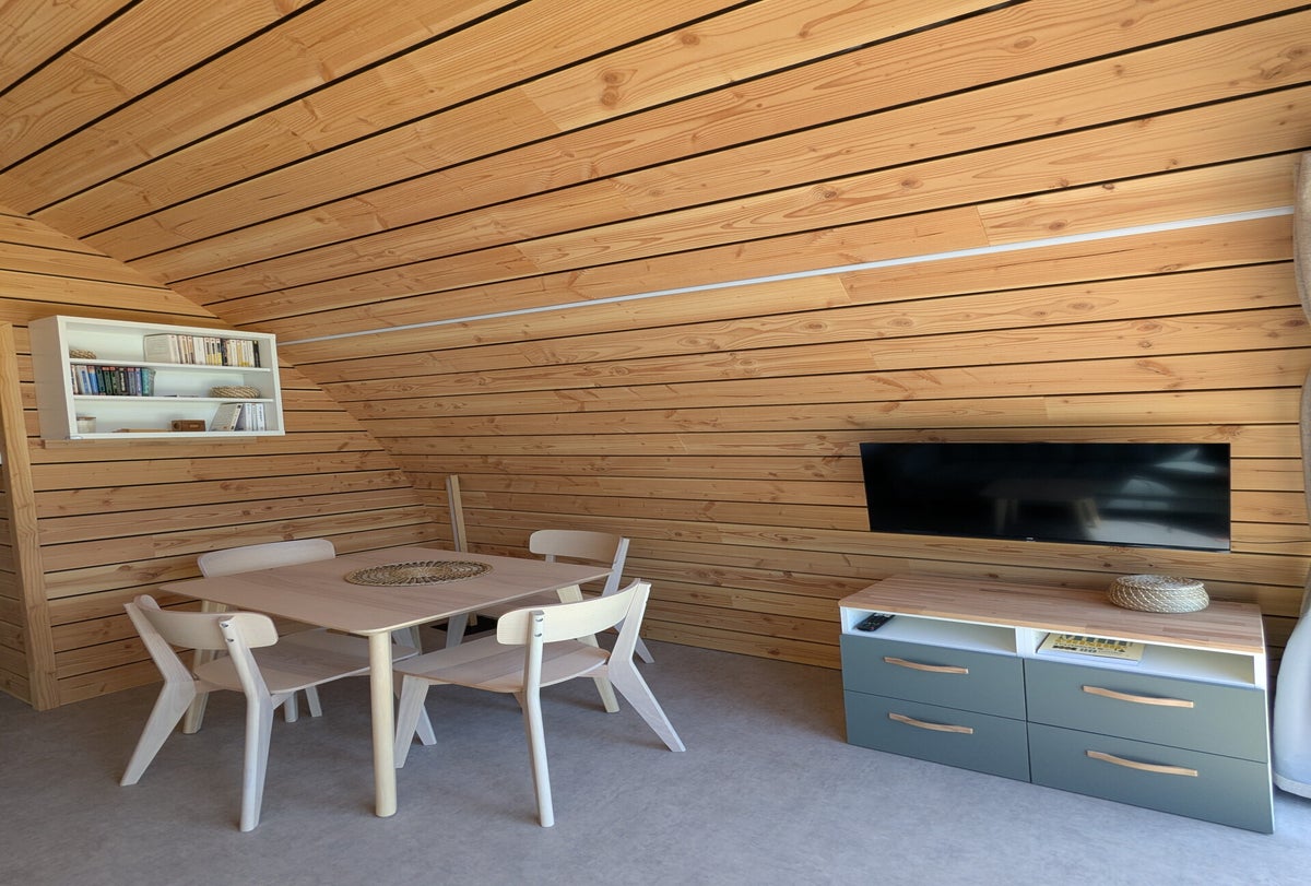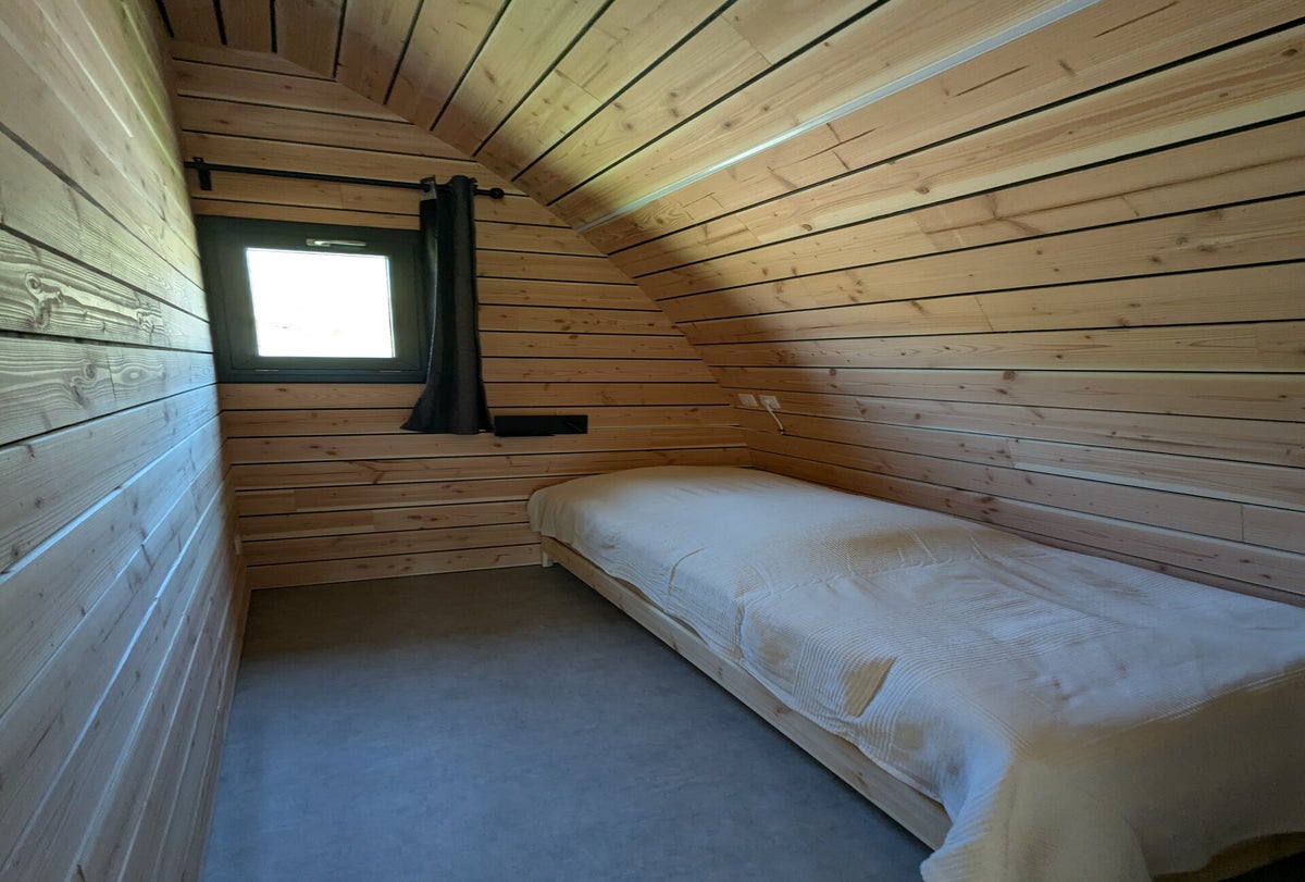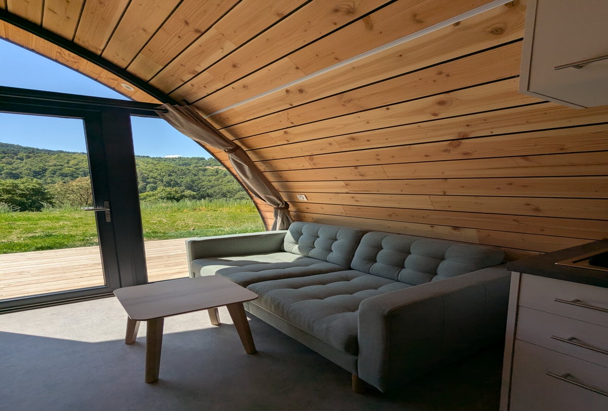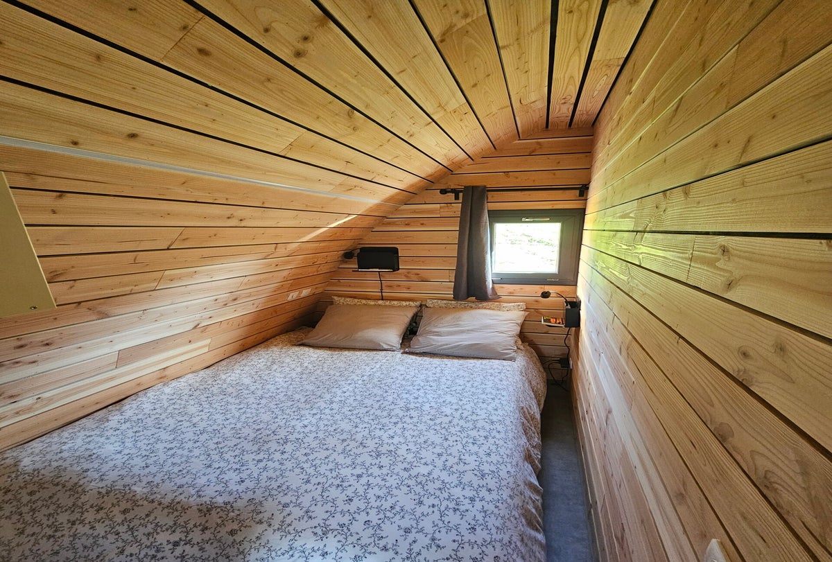 Située en contrebas de la cabane d’Antoine, la cabane de Romane profite d’un emplacement plus retiré, au calme, au plus près des arbres. Depuis sa terrasse aménagée avec deux transats et une table basse, vous pourrez admirer la vue dégagée sur les champs et la forêt du Mont Lozère.